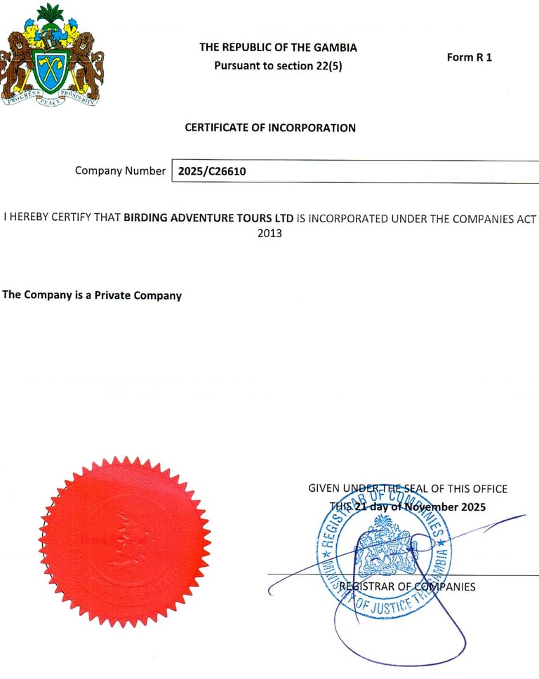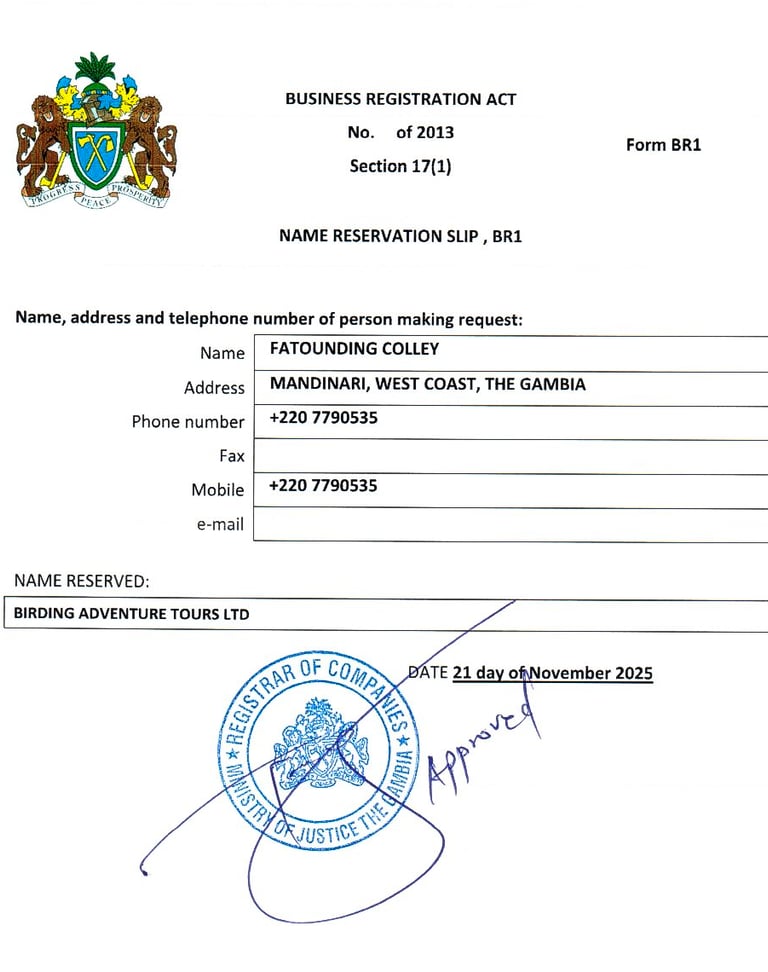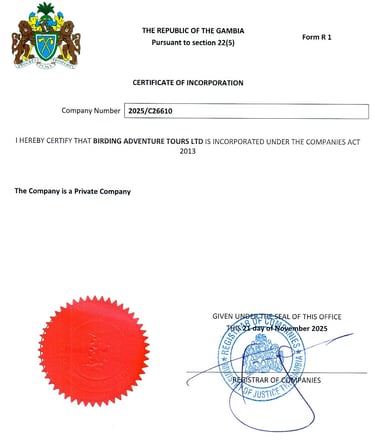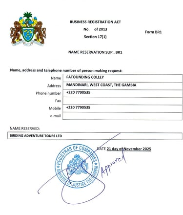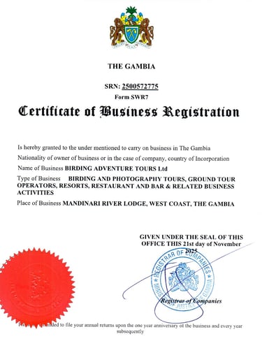 Mijn onderneming Birding Adventure Tours LTD is officieel geregistreerd én erkend bij de Gambia Tourism Board en heeft haar hoofdzetel in Mandinari River Lodge, West Coast, The Gambia. Hierdoor kan ik iedere reiziger die door mijn onderneming wordt begeleid of gegidst een eerlijke en veilige rondreis bieden, ondersteund door de Gambia Tourism Board.